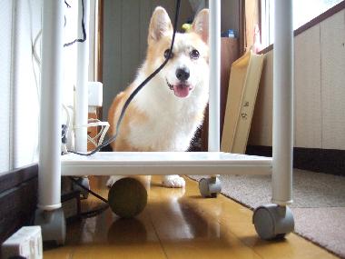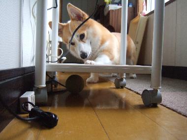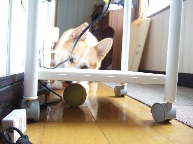 」としゃべってるので、「どーしたの?」と見てみたら、電話台の下にボールがあったらしく、