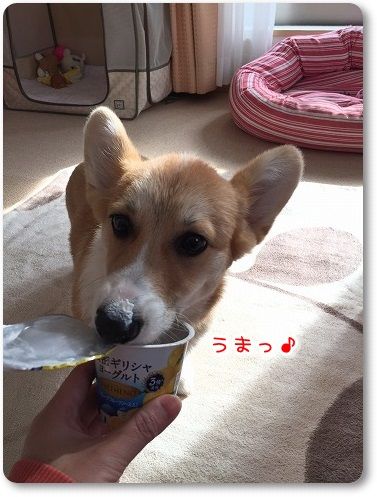 お鼻にヨーグルトをつけて可愛いこと。ちなみにギリシャヨーグルトはオイラも好物です。