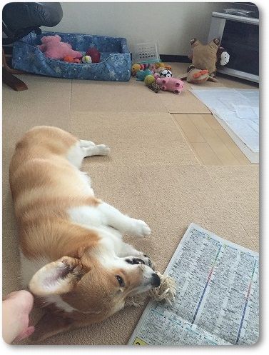 オモチャかごをひっくり返して、ロープも持ってきてカミカミ…