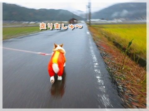 レインコートを着せると、散歩に行けるのがうれしいのかテンションMAX