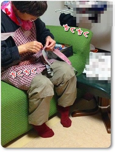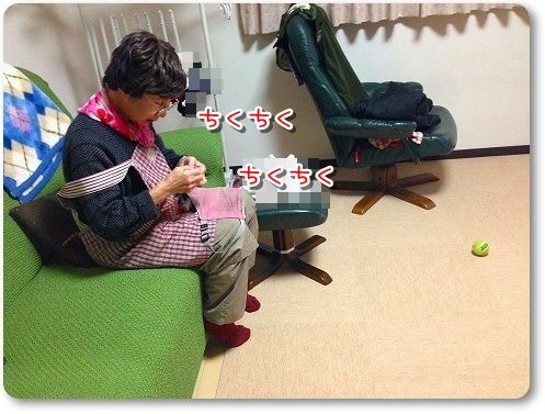 花さんがいないうちにと、お布団を縫い縫い。