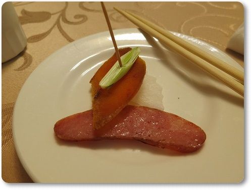 ここでは、ダックをちょっとだけ見せにきて、あとは切り分けた皮や身を持ってきて、