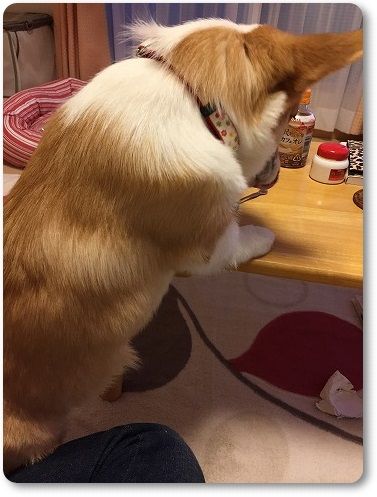 テーブルの上のモノを、くわえようとするので、余計なものは置いておけません。