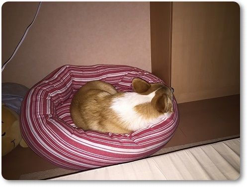 そこから、一緒にベッドに寝てみるか~と、横に寝かせてみたら、そのままへそ天で爆睡